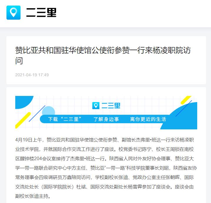 4月19日上午,赞比亚共和国驻华使馆公使衔参赞、副馆长杰弗里•班达一行来访杨凌职业技术学院,并就国际合作交流工作进行了座谈。校党委书记陈宁、校长王周锁在南校区醒钟楼204会议室接待了杰弗里•班达一行。陕西省人民对外友好协会理事、赞比亚大学一带一路联合研究中心中方主任、赞比亚“一带一路”科技学院董事长刘昭,陕西省友协常务理事会四级调研员万鑫陪同访问,学校副校长张迪、党政办公室主任张朝晖、国际交流处处长(国际学院院长)杜斌、国际交流处副处长杨雪霁参加了座谈会。座谈会由副校长张迪主持。
