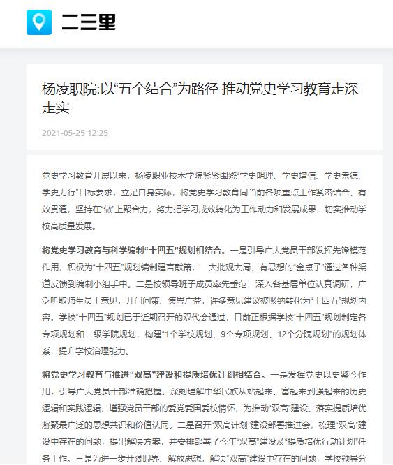 党史学习教育开展以来,杨凌职业技术学院紧紧围绕“学史明理、学史增信、学史崇德、学史力行”目标要求,立足自身实际,将党史学习教育同当前各项重点工作紧密结合、有效贯通,坚持在“做”上聚合力,努力把学习成效转化为工作动力和发展成果,切实推动学校高质量发展。