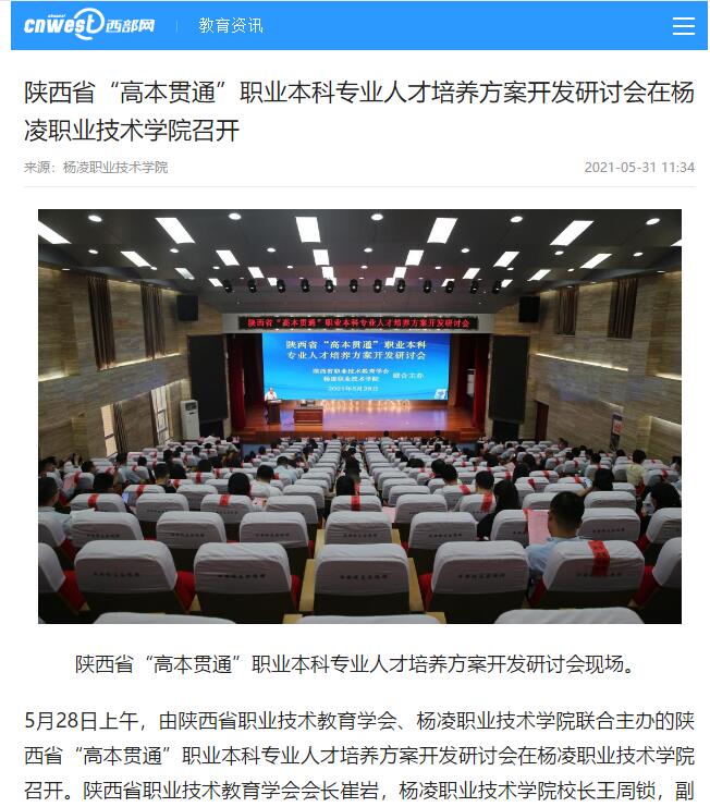 5月28日上午,由陕西省职业技术教育学会、杨凌职业技术学院联合主办的陕西省“高本贯通”职业本科专业人才培养方案开发研讨会在杨凌职业技术学院召开。陕西省职业技术教育学会会长崔岩,杨凌职业技术学院校长王周锁,副校长张迪、祝战斌,陕西省职业技术教育学会副会长、秘书长、副秘书长以及部分院校领导参加会议。会议由省职教学会副会长王晓江主持。
