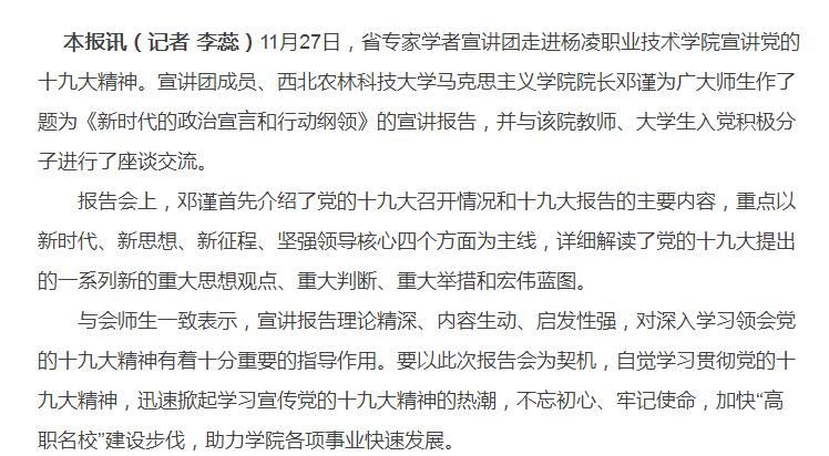 本报讯(记者 李蕊)11月27日,省专家学者宣讲团走进杨凌职业技术学院宣讲党的十九大精神。宣讲团成员、西北农林科技大学马克思主义学院院长邓谨为广大师生作了题为《新时代的政治宣言和行动纲领》的宣讲报告,并与该院教师、大学生入党积极分子进行了座谈交流。