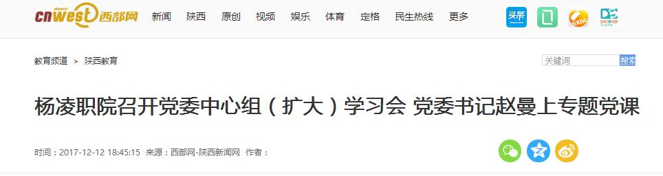 12月11日下午,杨凌职院党委书记赵曼主持召开党委中心组(扩大)学习会,并为中心组成员及机关副处级以上干部上学习十九大精神专题党课。