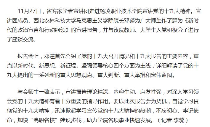 11月27日,省专家学者宣讲团走进杨凌职业技术学院宣讲党的十九大精神。宣讲团成员、西北农林科技大学马克思主义学院院长邓谨为广大师生作了题为《新时代的政治宣言和行动纲领》的宣讲报告,并与该院教师、大学生入党积极分子进行了座谈交流。