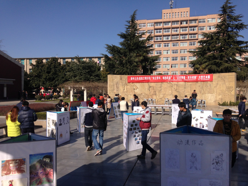 2015年12月16日,告别多日雾霾,终于迎来灿烂的阳光。由校团委、校书画艺术中心主办,信息工程分院团总支承办的二〇一五年“十大节庆—新年之约”之“多彩青春·欢乐校园”大型艺术展在南校区文化广场盛大举行。