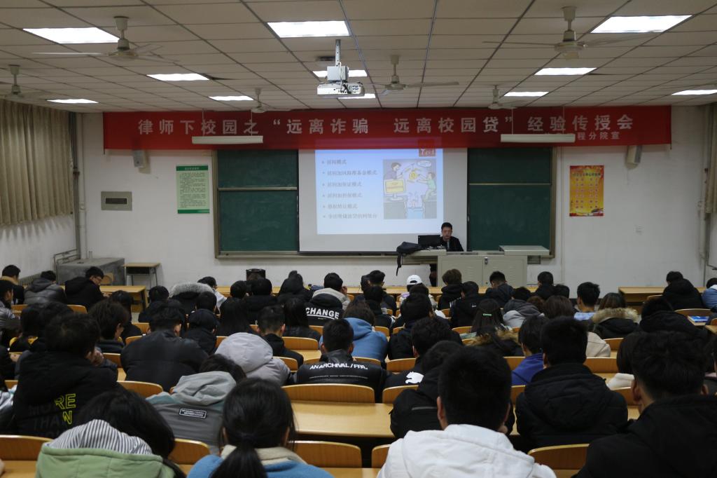 近年来“校园贷”染旧作新,带着不同名目的诱惑走入校园。为提高学生的自我防范意识和能力,切实加强学生安全防范工作。也为了配合学校“纪律安全月”活动。12月18日下午,由陕西松意律师事务所、我校法律顾问薛亚栋律师为信工分院学子在南校NOC201做了“远离诈骗,远离校园贷”报告会。