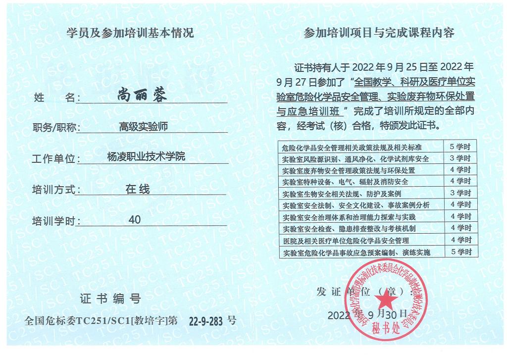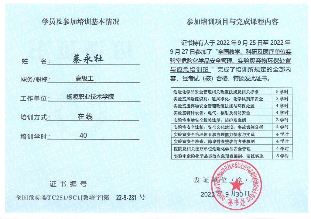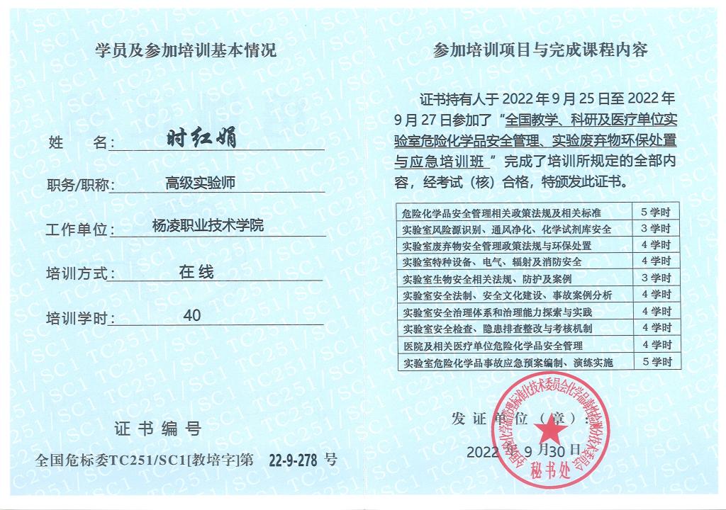 本次培训由全国危险化学品管理标准化技术委员会、化学品毒性检测分技术委员会主办,培训内容包括实验室危险化学品安全管理与实验室建设,实验室“三废”管理与环保处置,实验室特种设备、辐射安全、电气及消防安全,新形势下实验室生物安全建设管理与防护,实验室CMA、CNAS、GLP管理体系介绍,医疗机构危险化学品安全管理,应急管理体系建设与实践,实验室安全、环保、智能化设备及新技术应用8个方面。经在线培训、做学习笔记、安全考试,我院7名实验管理人员均完成了培训规定内容并全部考核合格。