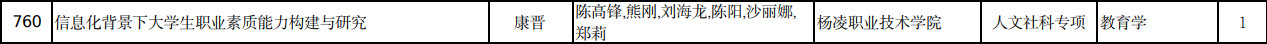 近日,2023年度陕西省教育厅科学研究计划拟立项项目结果公布,我院康晋老师主持的“信息化背景下大学生职业素质能力构建与研究”项目成功立项,获批为一般专项。