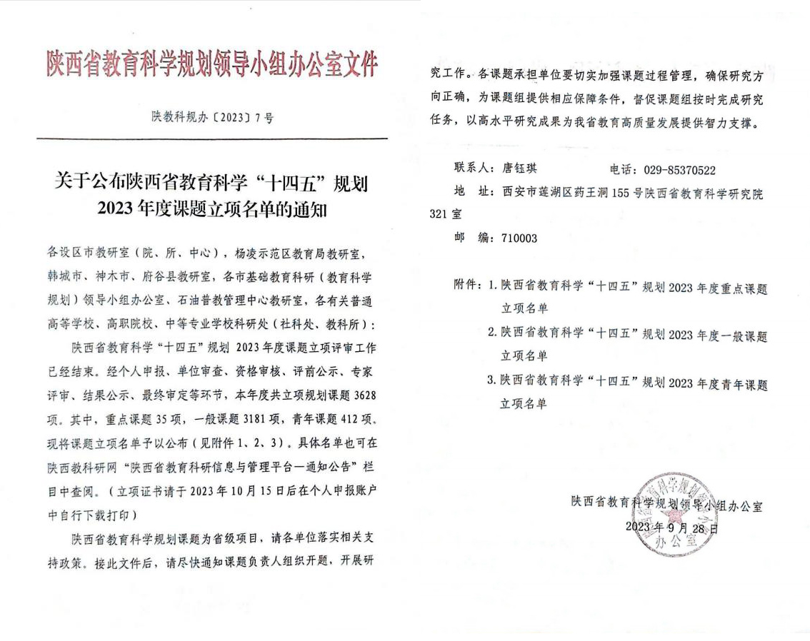 近日,陕西省教育科学“十四五”规划2023年度课题立项名单公布,学院教师熊刚主持的《高职信息技术类专业“产学研用创”五位一体科教融汇人才培养模式的研究》课题项目成功立项。