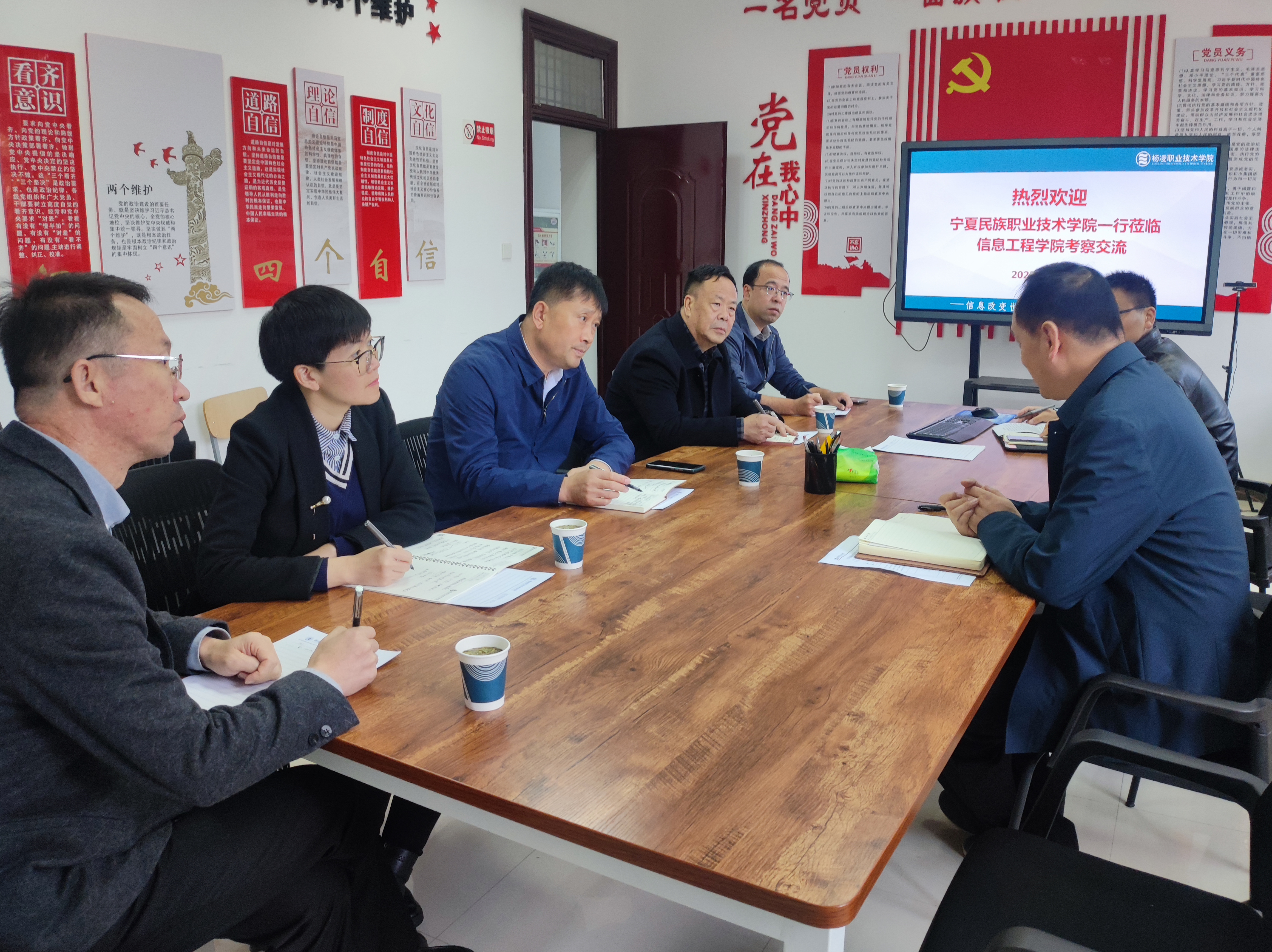 10月25日上午,宁夏民族职业技术学院党委副书记、院长焦玉柱带领农牧科技系主任王继东、教务处副处长朱海璐、设备管理中心与信息中心主任马郭兴、教育系主任马孝林一行五人莅临信息工程学院考察交流。信息工程学院院长陈高锋、副院长熊刚参加座谈。