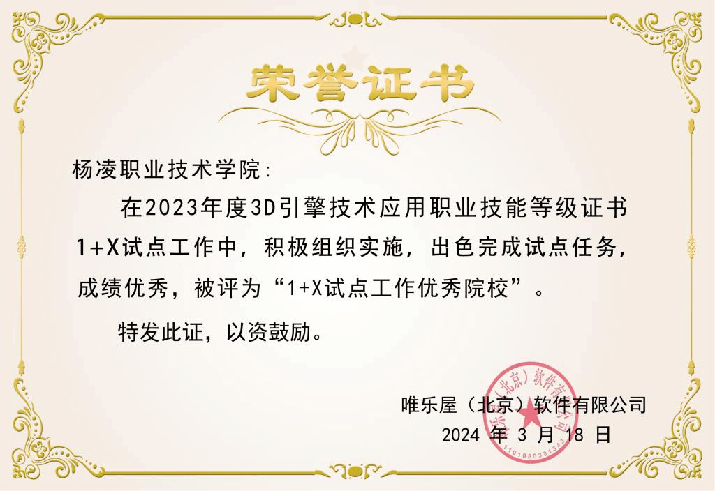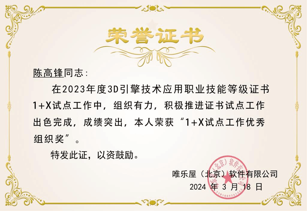 我校在2023年度3D引擎技术应用职业技能等级证书1+X试点工作中,表现出色,成绩优异,获得“1+X试点工作优秀院校”殊荣。陈高峰同志在2023年度3D引擎技术应用职业技能等级证书1+X试点工作中,组织有力,成绩突出,获“1+X试点工作优秀组织奖”。