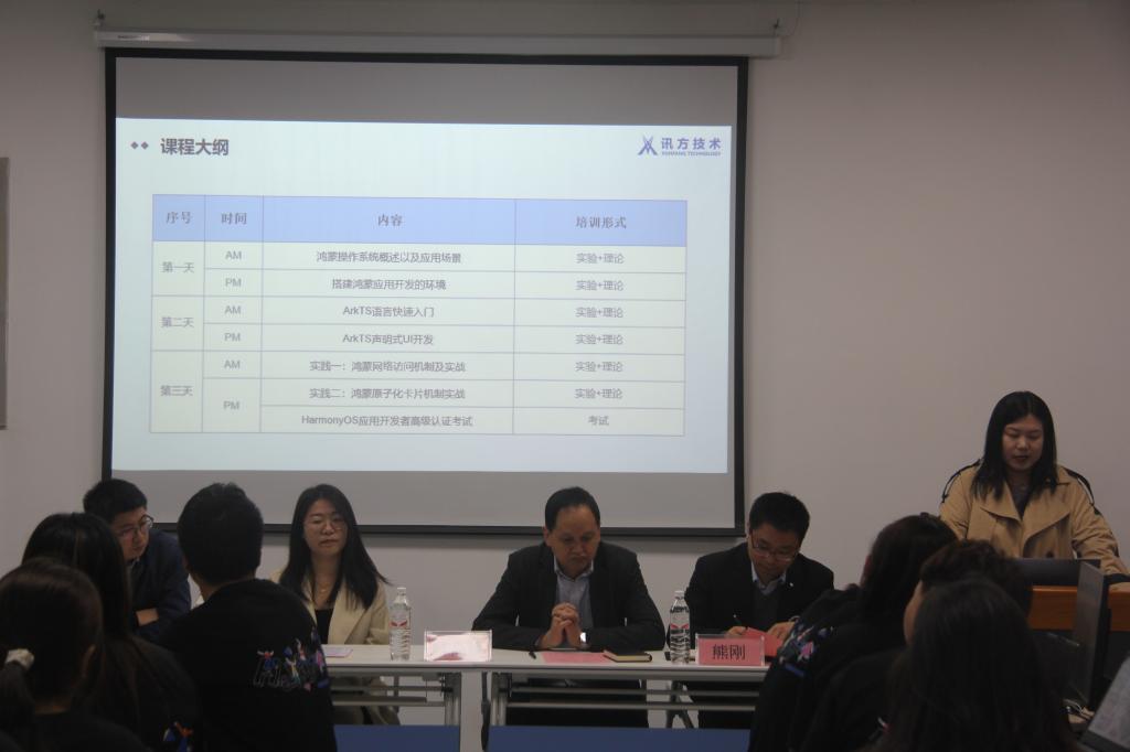 王珊珊感谢信息工程学院领导以及学院师生对本次训练营培训活动的支持,希望通过此次训练营活动,能够让更多的师生了解HarmonyOS应用开发的相关知识,也希望进一步加深华为和讯方技术公司与信息工程学院的合作交流,并预祝本次活动圆满成功。随后,张健就华为云的基本情况、人才培养以及HarmonyOS的应用场景等方面做了详细介绍。文娟向参加本次训练营的全体同学讲解了本次HarmonyOS人才训练营授课内容、培训计划以及考试要求。