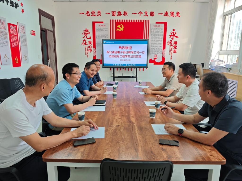 6月13日下午,西北铁道电子股份有限公司研发中心总经理张国虎、技术部副总经理韩金龙、研发中心软件工程师刘晨一行3人莅临信息工程学院洽谈交流,信息工程学院院长陈高锋、副院长熊刚、电子教研室主任闵卫锋、应用电子技术专业教师代表马安良参加座谈。