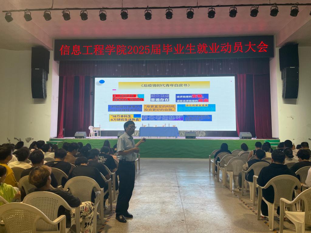 陈高锋在主持时强调了就业形势的严峻与挑战,并鼓励同学们要树立信心,积极应对。接着,吴高潮对全体毕业生进行了动员讲话,他表示,2025届毕业生学子即将面临的就业压力不容乐观,并对求职准备的具体事项进行了详细讲解,包括简历撰写、面试技巧和职业规划等。