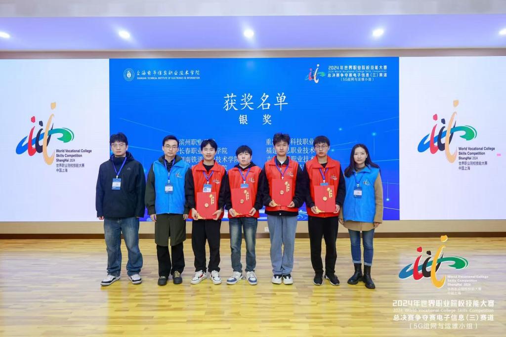 10月25日至28日,2024年世界职业院校技能大赛总决赛争夺赛电子信息(三)赛道“5G组网与运维”赛项在上海市上海电子信息职业技术学院举办。本次大赛由教育部等35家部委主办,上海市教育委员会承办,上海电子信息职业技术学院协办,大赛共有来自全国31个省、市、自治区的61支参赛队伍同台竞技。我校信息工程学院樊勇杰、南疆、陈维浩、杨光照4名同学组成的团队顶着被全场观摩的压力,经过45分钟的技能展演,最终荣获该赛项银奖。
