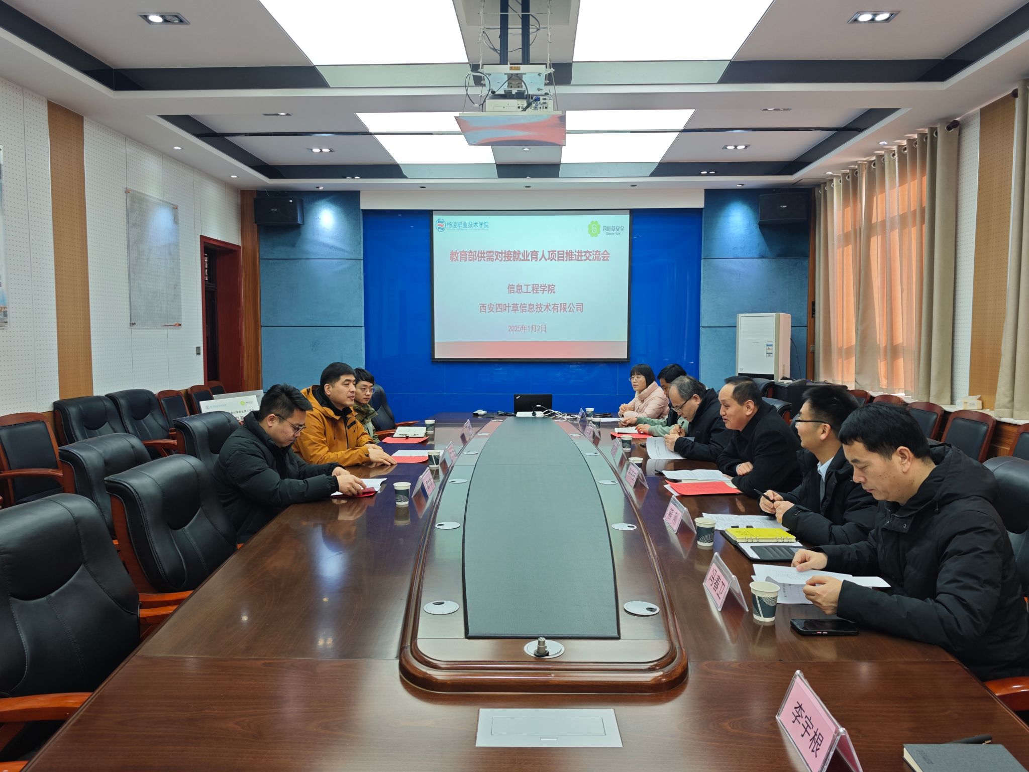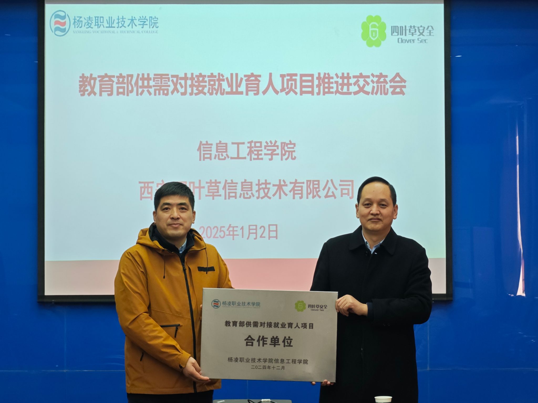 1月2日上午,信息工程学院与西安四叶草信息技术有限公司的“教育部供需对接就业育人项目”推进交流会暨授牌仪式在秦风楼四楼会议室成功举行。院长陈高锋、党总支副书记吴高潮、副院长熊刚、学工办主任任争峰、网络教研室主任冯春卫及教师代表,西安四叶草信息技术有限公司安全教育事业部总监刘伟等参加了授牌仪式及座谈会。本次项目推进交流暨授牌仪式由陈高锋主持。