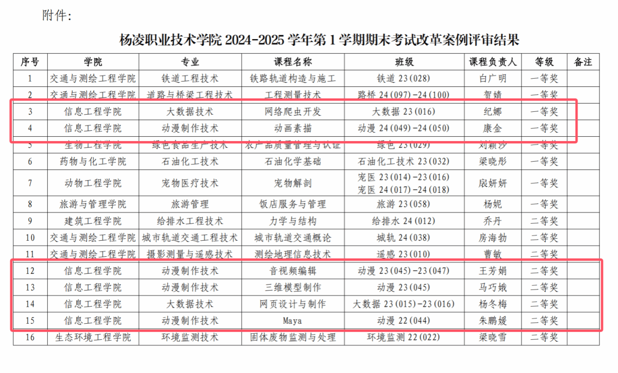 2025年4月8日,杨凌职业技术学院2024-2025 学年第1学期期末考试改革案例评审结果公布。经学院推荐、教务处形式审查以及学校教学指导委员会专家评审,最终我院荣获一等奖2项,二等奖4项,三等奖3项。