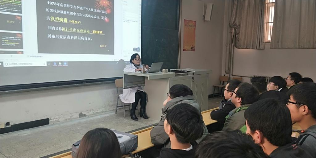 肾综合征出血热又名“流行性出血热”,是由汉坦病毒引起的,以鼠类为主要传染源的一种自然疫源性疾病,临床上以发热、休克、充血、出血和急性肾功能衰竭为主要表现。国内1935年发现本病,1942年定名为流行性出血热,1982年由WHO统一命名为肾综合征出血热。本病流行于世界许多国家,区,我省关中为出血热疫区。近期,网络报道西安某高校出现出血热病死案例,引起了学院的高度警觉,为了加强学生的疾病防范意识,进一步提高学生对“流行性出血热”知识的了解,更好地做好“流行性出血热”防范工作,12月26日下午,信息工程分院在南校区醒钟楼NOB107阶梯教室举办了“肾综合征出血热”预防知识讲座,邀请专家为学校医院的李荣老师,信息工程分院的全体学生干部及各宿舍舍长聆听了讲座。