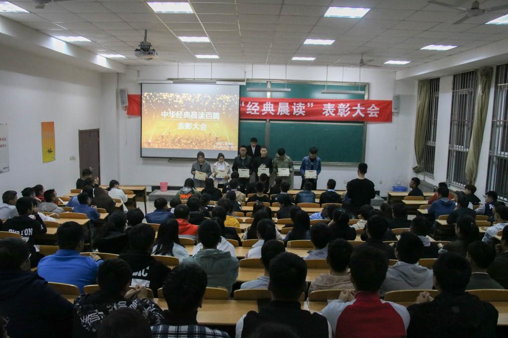 2017年11月14日晚上7:00,信息工程分院在北校区BOA-121教室举办了“中华经典晨读百篇表彰大会”。此次大会由分院学生会纪检部与实践部联合举办,各班班级代表和学生代表共150多人参加了此次表彰大会。