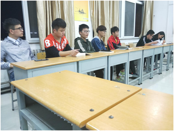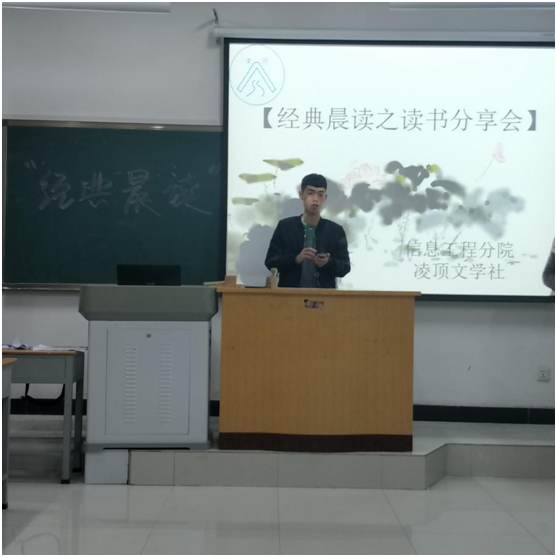信息工程分院凌顶文学社于2017年11月8日晚在北校区举办了一场围绕“经典晨读”为主题的读书分享交流会。分享会由文学社社长主持,首先他分享了柴静的《看见》讲述自己的感想,并请在座的同学们点评,随后文学社14个同学依次登台,推荐书目、分享阅读、交流经验、畅谈体会。同学们结合自身读书经验做了深入的交流,最后,由副社长总结致辞,为读书分享会画上了圆满的句号。