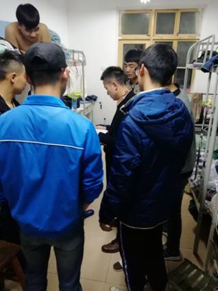 本次检查中,绝大部分宿舍都能做到桌面物品摆放整齐、地面干净整洁,没有发现违规大功率电器,宿舍整体的良好状况反应了分院学生良好的精神面貌。对于部分宿舍存在室内吸烟、随手乱丢烟头的违纪情况,冉博文老师也现场进行了批评教育。