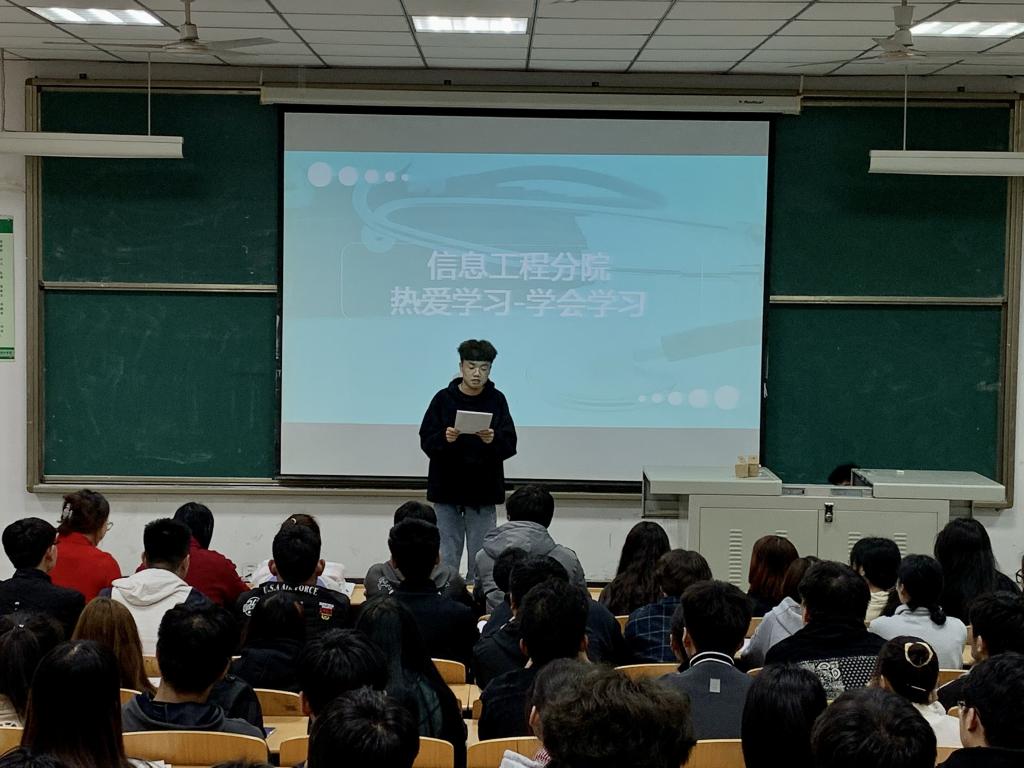 为了进一步加强学风建设,全面落实“四位一体”人才方案,充分发挥优秀学生的带头作用,信息工程学院学生工作办公室于4月25日18时50分在醒钟楼NOB-101台阶教室举行了学习经验交流演讲赛。比赛由学生工作办公室辅导员梁晶晶主持,辅导员王茜及153名各班优秀学生代表参加。