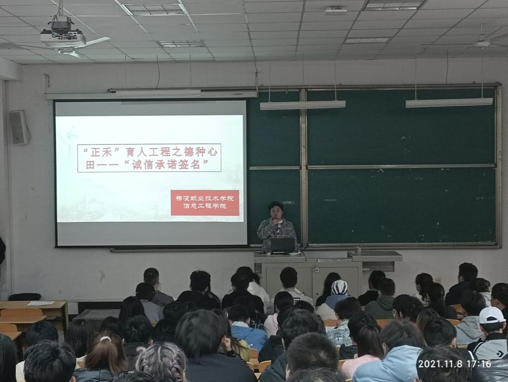 活动中,信息工程学院2021级学生代表集体签名,并以班为单位开展诚信教育主题班会,组织每名学生签订了以考试诚信、学术诚信、资助诚信、消费诚信、求职诚信为主要内容的“诚信承诺书”。