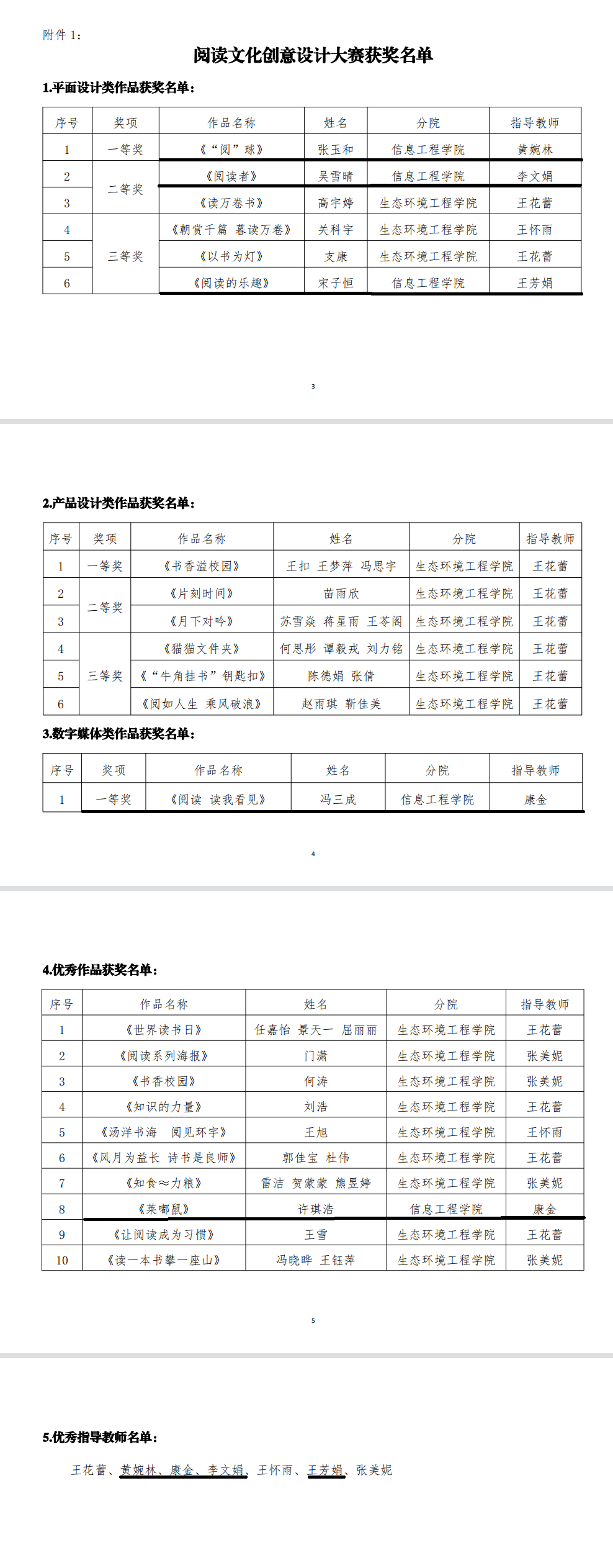 在阅读文化创意设计大赛-平面设计类作品征集比赛中,我院学子张玉和获得一等奖,吴雪晴获得二等奖,宋子恒获得三等奖;在数字媒体类作品征集比赛中,我院学子冯三成获得一等奖;许琪浩获得优秀作品奖;我院黄婉琳老师、李文娟老师、康金老师、王芳娟老师获得优秀指导教师。