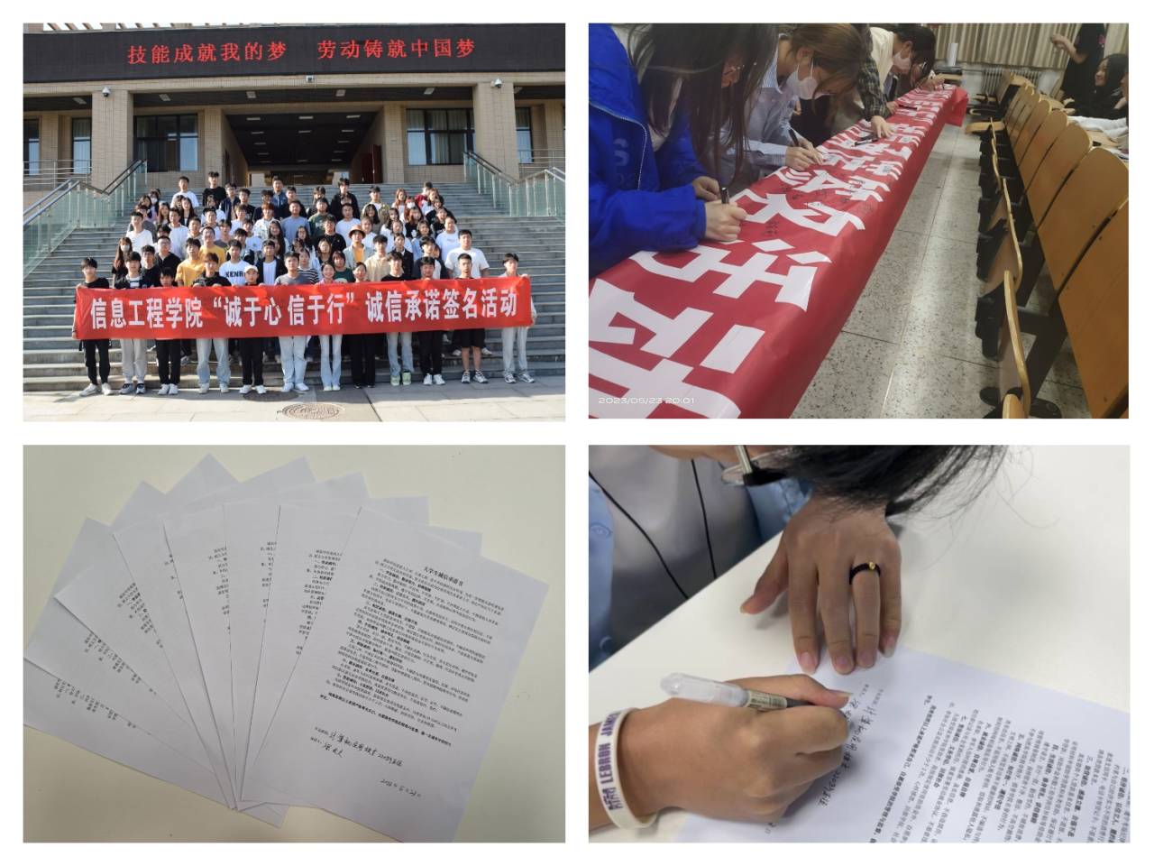 诚信承诺签名,我承诺、我践行。为进一步在校园内形成重诚信、讲诚信、守诚信的良好风气,5月22日,信息工程学院于NOB-203举行诚信承诺签名活动,以“诚于心,信于行”为主题,学工办辅导员李晶宣讲此次活动的目的、流程,从个人、家庭、社会、国家等角度出发阐明了诚信的重要性,强调大学生诚信是立身处事之本,随后组织学生代表集体宣誓,将做到学业诚信、经济诚信、助贷诚信、网络诚信、就业诚信,最后同学们纷纷诚信条幅上写下自己的名字。会后以班级为单位,组织全体学生签署《诚信承诺书》,表明我承诺、我践行的决心。