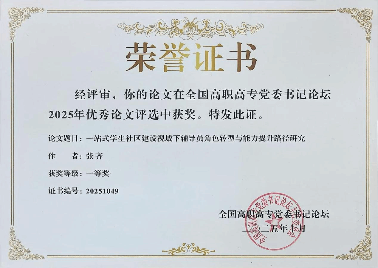 在大会论文征集与评选活动中,我院组织教职员工围绕论坛主题积极参与论文撰写,辅导员张齐老师的论文《“一站式”学生社区建设视域下辅导员角色转型与能力提升路径研究》荣获一等奖。该论文立足“一站式”学生社区建设实践,从制度创新与队伍建设的双重视角探讨辅导员角色的转型方向与能力提升路径,具有较强的理论深度与实践指导意义。