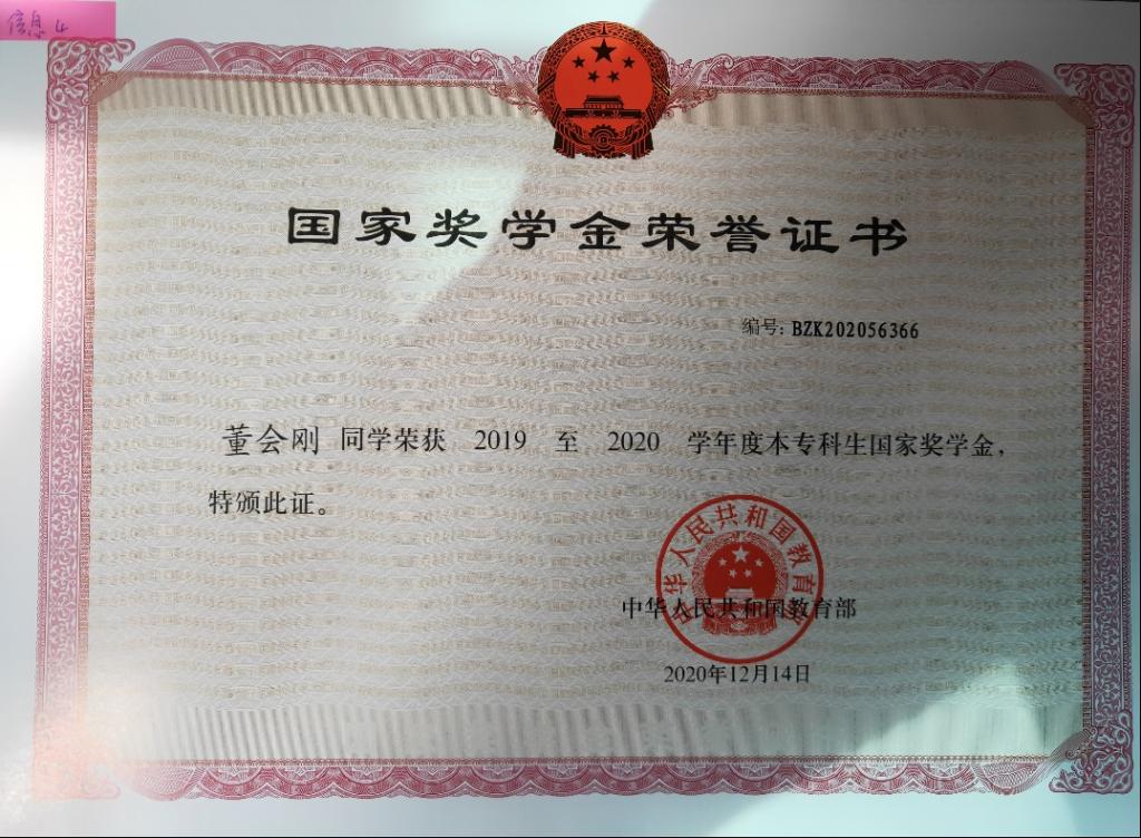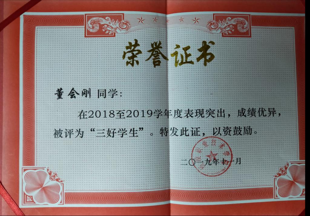 荣获2019-2020学年学习成绩优秀奖等荣誉