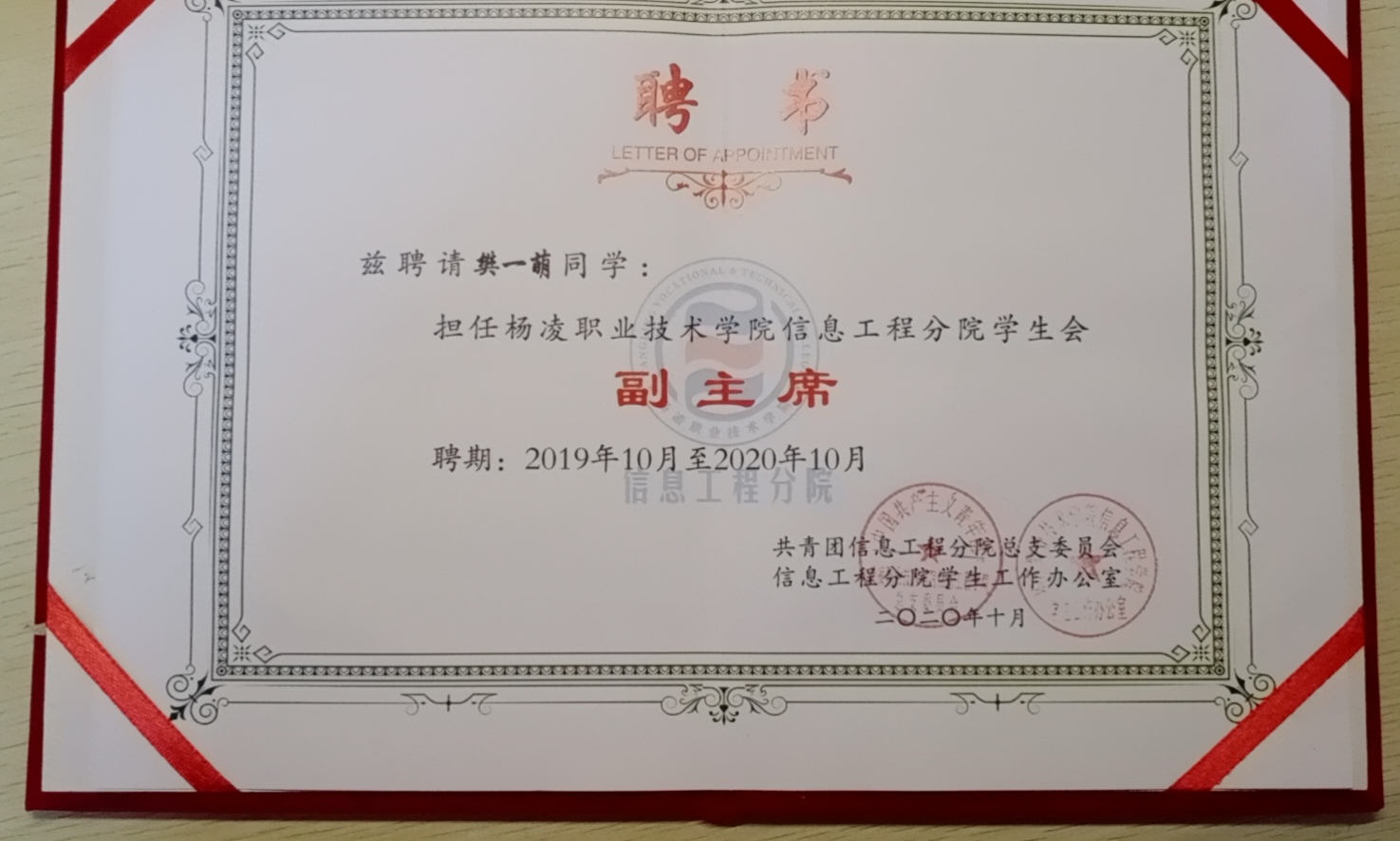 在校情况:在校期间加入了分院团总支,由于表现优异大二时成为了团总支组织部副部长,平时在校学习认真,吃苦耐劳,爱好参加各种志愿者活动。