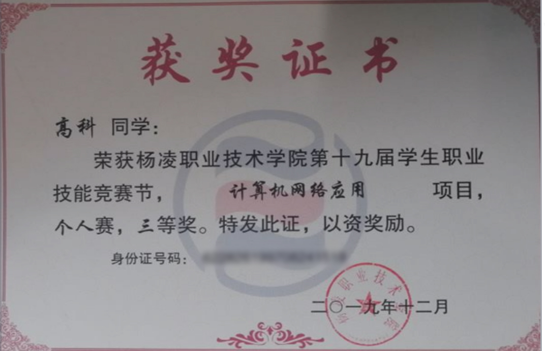 2019参加杨凌职业技术学院19届学生职业技能竞赛节计算机网络应用项目荣获个人赛二等奖。