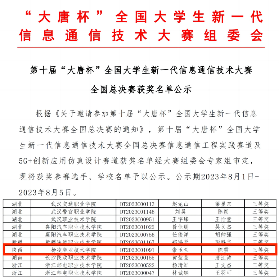 2023年7月30日,第十届“大唐杯”全国大学生新一代信息通信技术大赛(高职组)全国总决赛在武汉职业技术学院落下帷幕,我校现代通信技术专业学生张玉兰、陈雪获国赛三等奖。