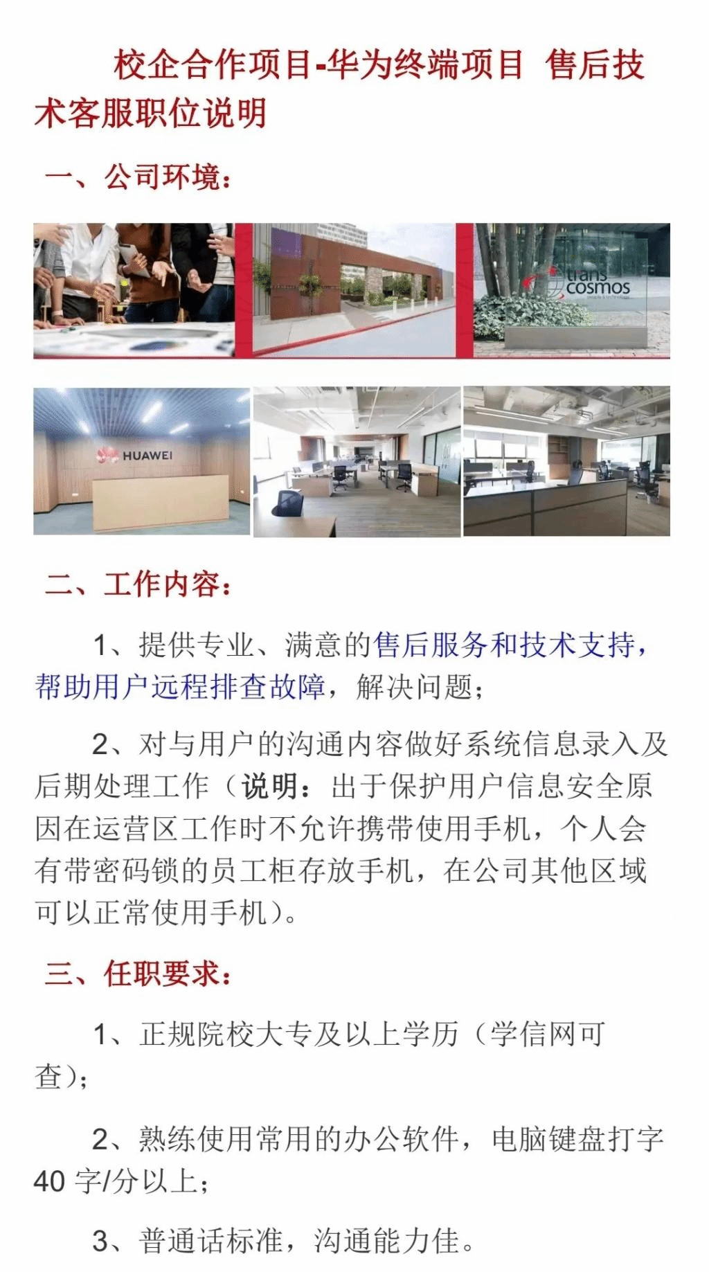 华为终端业务(原华为消费者业务)隶属于华为技术有限公司,是华为核心三大业务之一。产品全面覆盖手机、移动宽带及家庭终端等。作为合作多年的华为终端业务战略合作项目供应商的TRANSCOSMOS,此次开启西安校企合作,需求专业为计算机、软件、数据、通信、电子、动漫等相关专业学生。
