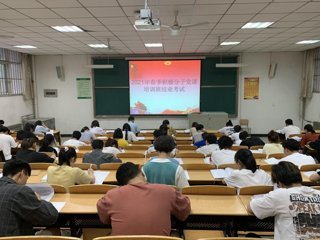 2021年5月10日信息工程学院春季党课培训班结业考试在醒钟楼NOB-101教室进行,本次考试由学工办主任任争峰、党课培训班主任梁晶晶负责,参加本次考试的同学共计138人,结业考试开始时间是19时,考试时间为两小时。党课考试在座位安排上按照对号入座的形式进行,增加了考试的严谨性。此次党课考试的试题类型分为选择题、问答题、论述题。考场上同学们奋笔疾书,认真审题,细心作答,弥漫着紧张严肃的气氛。