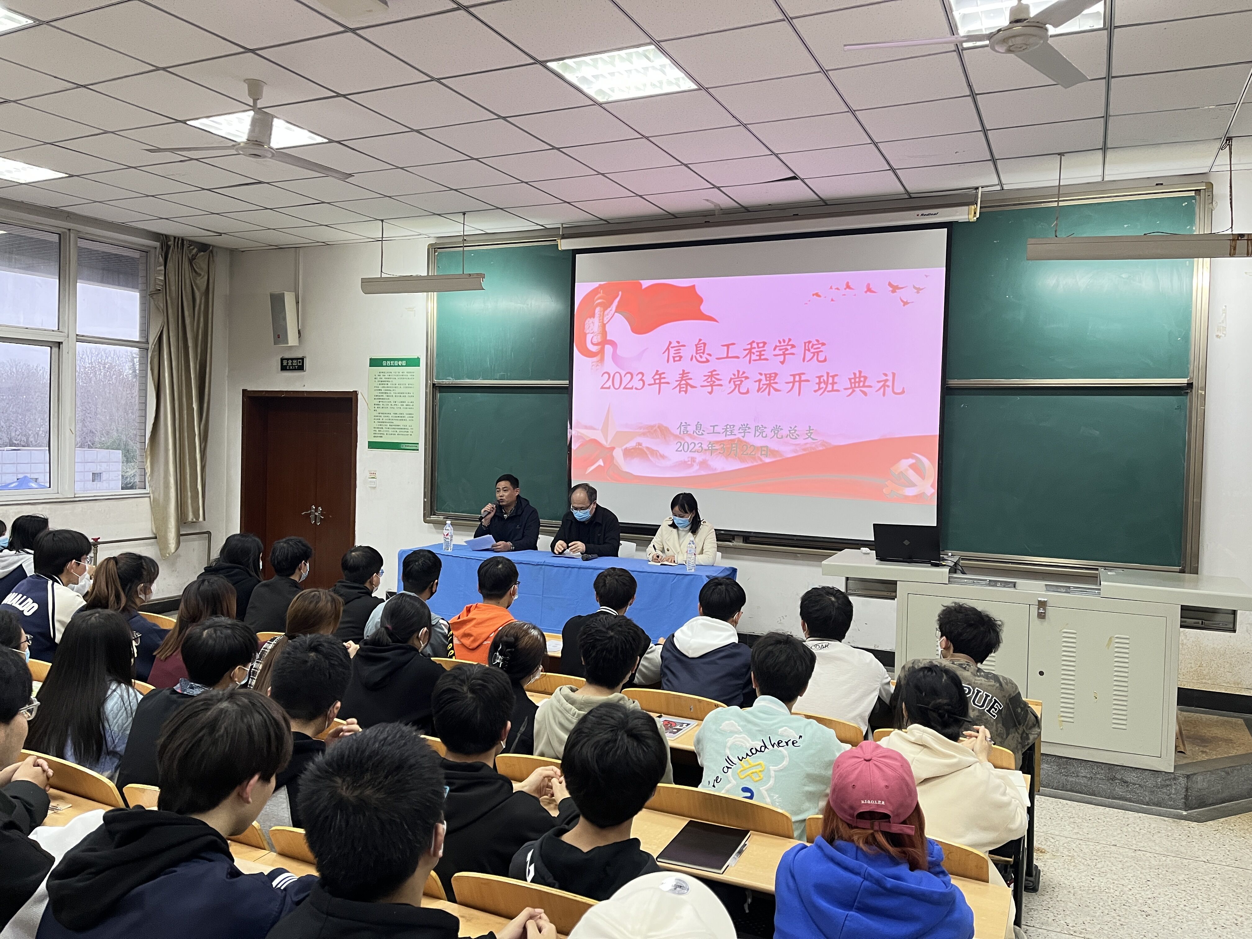 按照杨凌职业技术学院党校关于入党积极分子培训总体部署,信息工程学院党总支精心筹划,认真准备,3月22日18点30分在醒钟楼NOB-203阶梯教室,伴随着庄严的《中华人民共和国国歌》歌声,信息工程学院党总支2023年春季入党积极分子培训班正式开班。开班仪式由党总支组织委员、学生工作办公室主任任争峰主持,分院党总支副书记吴高潮,党务秘书、培训班班主任梁晶晶及121名学员参加开班仪式。