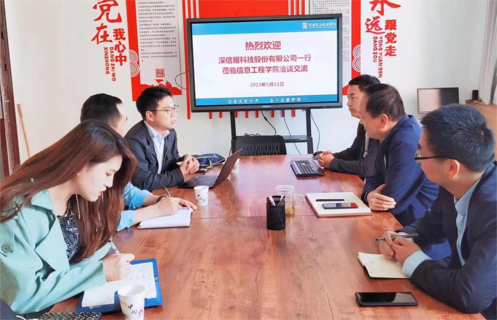 5月11日下午,深信服科技股份有限公司陕西区产教融合总监彭文凯、深信服陕西区教育行业总监马超等一行三人来我校洽谈交流,信息工程学院院长陈高锋、副院长熊刚及冯春卫等教师出席洽谈会。