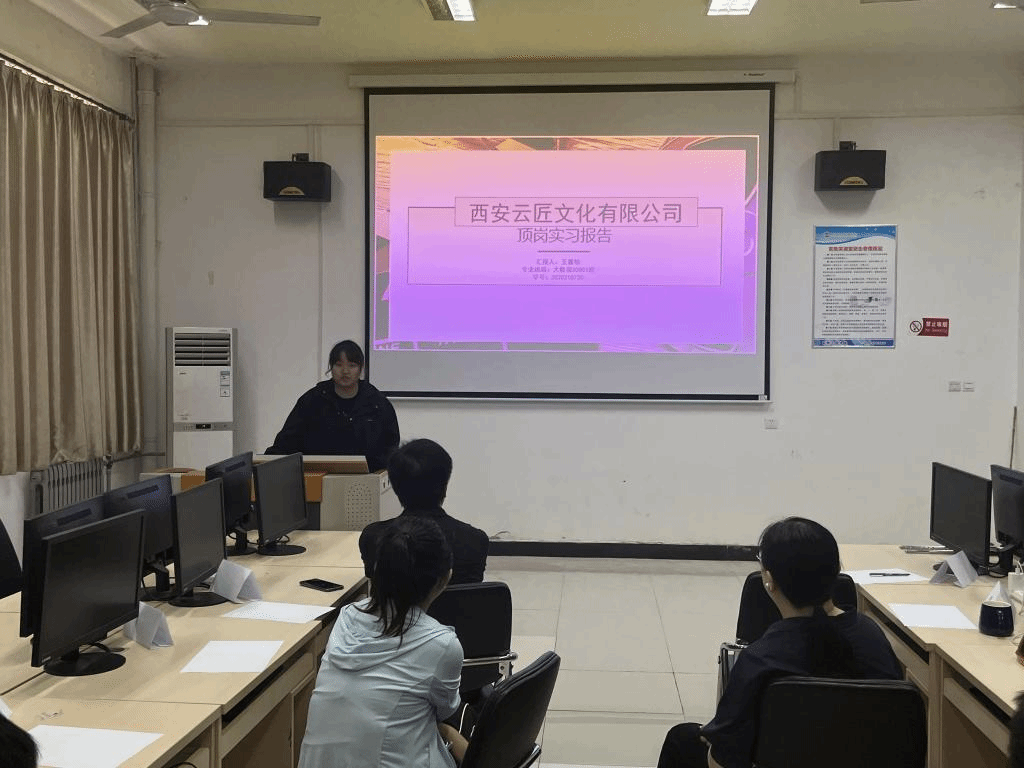 本次答辩分为学生汇报和教师提问两个环节。学生分别从实习单位介绍、岗位介绍、实习心得体会以及后期职业规划等方面进行了汇报。企业指导教师和学校指导教师针对每个学生的答辩提出问题,学生现场进行解答。最后,薛海斌老师为毕业生们送上祝福和寄语,希望同学们在今后的工作学习中努力奋斗、克服困难、不断进取、追求梦想。