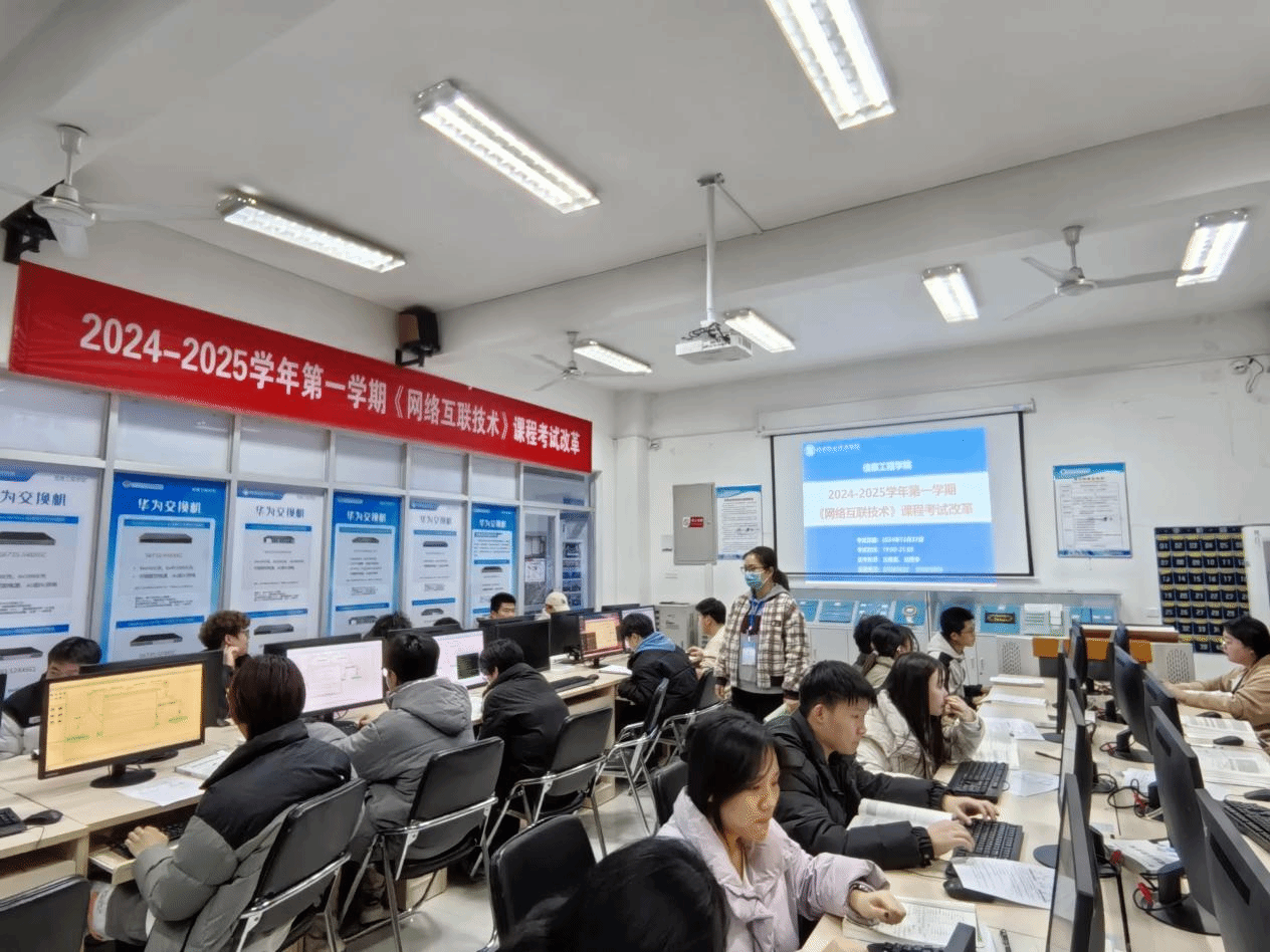 为适应信息技术的快速发展和网络工程领域对人才能力的新要求,有效推动课程建设和教学质量,2024年12月23日至25日,计算机应用技术专业9个班的学生在南校区醒钟楼NOD529、NOD604、NOD609实训室完成了《网络互联技术》课程改革考试。