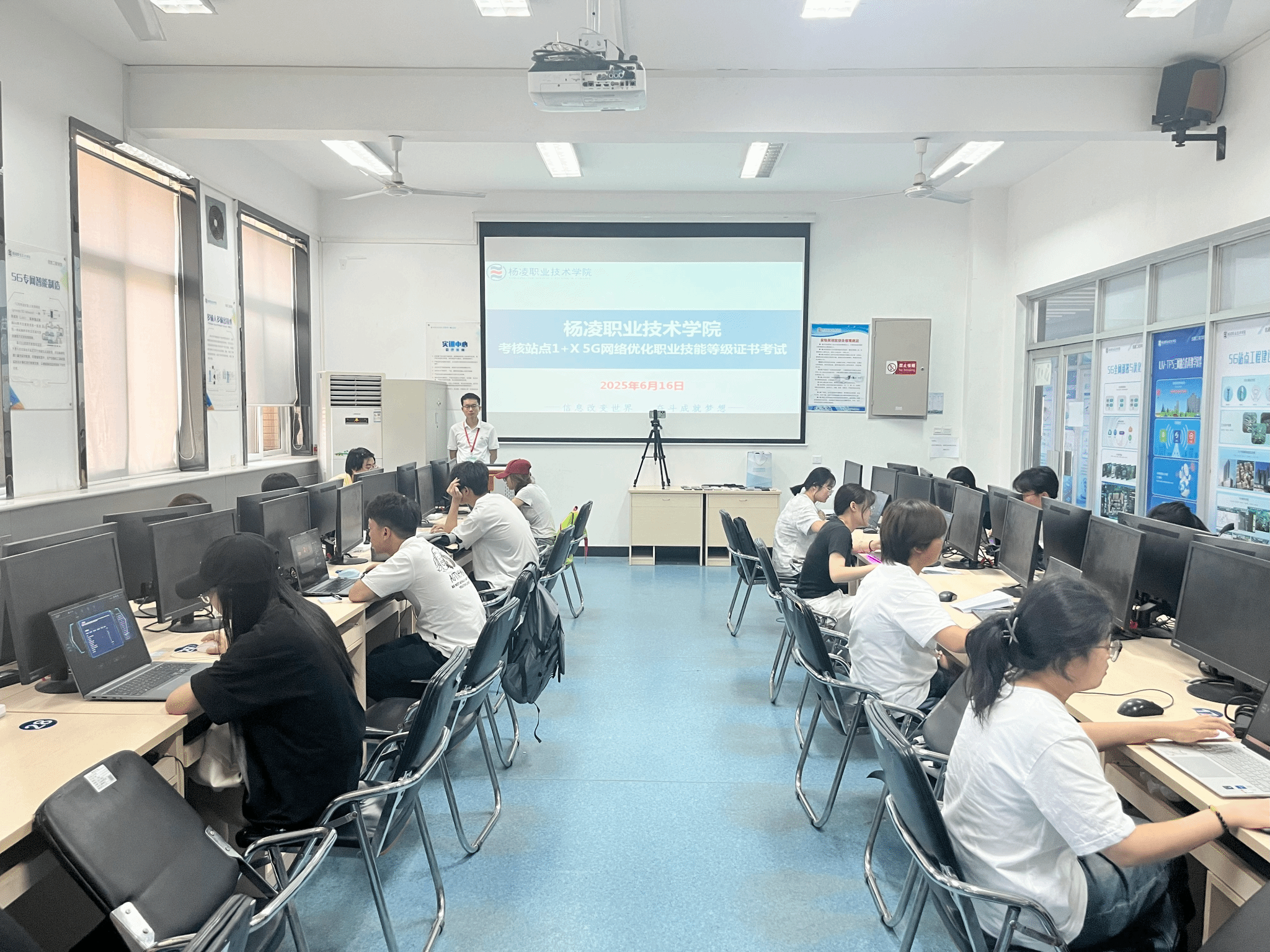 2025年6月16日(星期一)9:00至12:00,我院于醒钟楼NOD505实训室顺利组织完成了5G网络优化(中级)职业技能等级证书考试工作。本次考试共有现代通信技术专业20名学生参加。考试采用理论与实操相结合的形式,重点考查学生在5G网络信息采集、5G网络测试、5G网络信息管理以及5G端到端网络优化等四个方面的知识储备与实践操作能力。