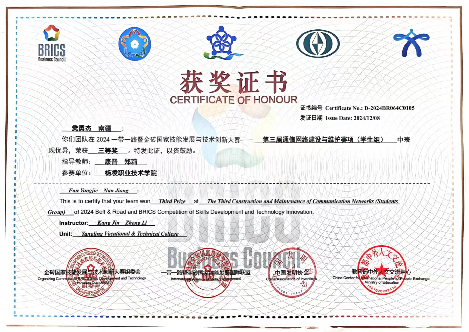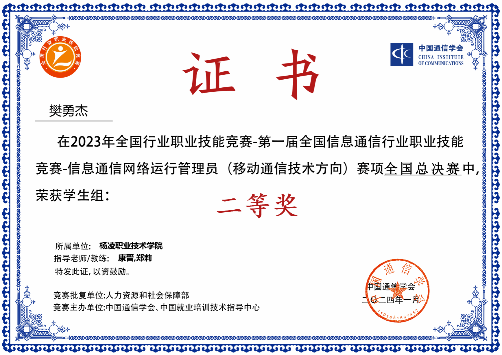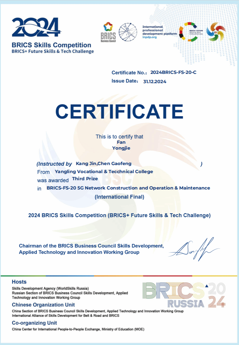 2024年通信专业学生获金砖全国技能大赛三等奖