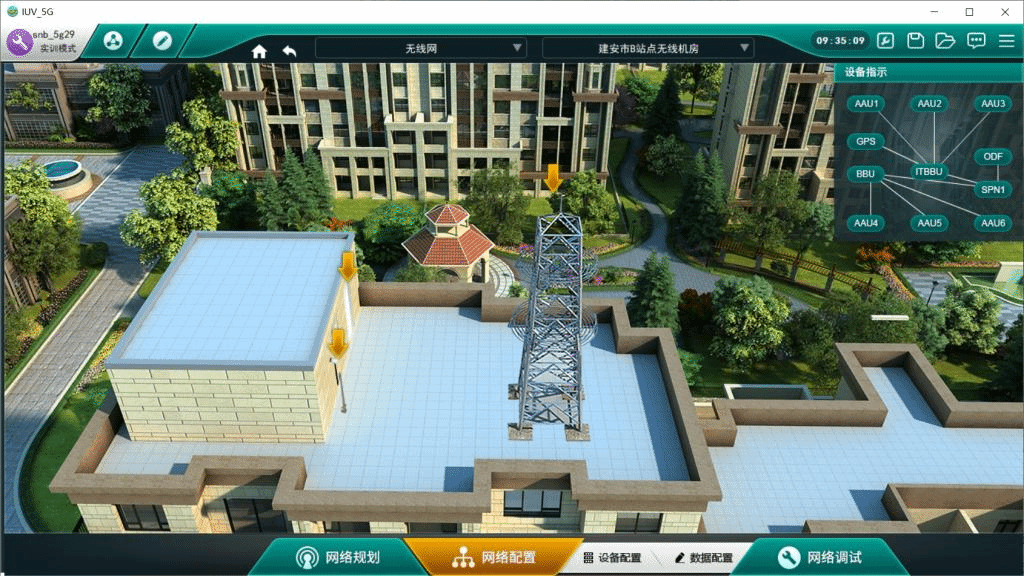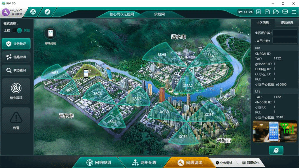 本课程依托5G网络真实岗位的典型工作技能设计,主要通过两个大型3D仿真模拟软件“5G全网部署仿真与优化”和“5G站点工程建设”实现整个教学过程,软件设有三大城市的通信全网模拟场景,涵盖5G网络通信原理、5G通信网络工程规划设计及部署、5G通信网络故障排除与应用优化等内容。课程内容紧扣全国职业院校技能大赛“5G全网建设技术”赛项。