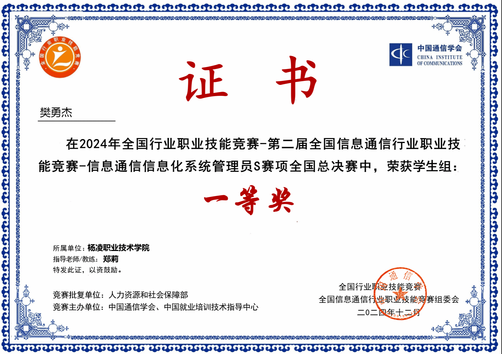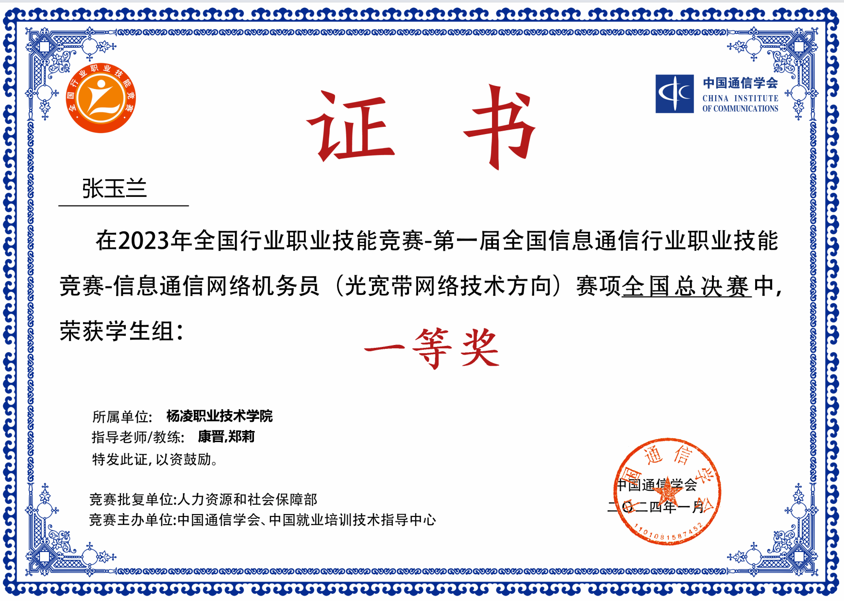 2024年通信专业学生获行业技能大赛全国一等奖
