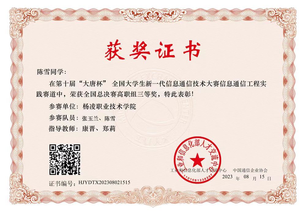 2023年通信专业学生获通信技能大赛行业赛决赛一等奖